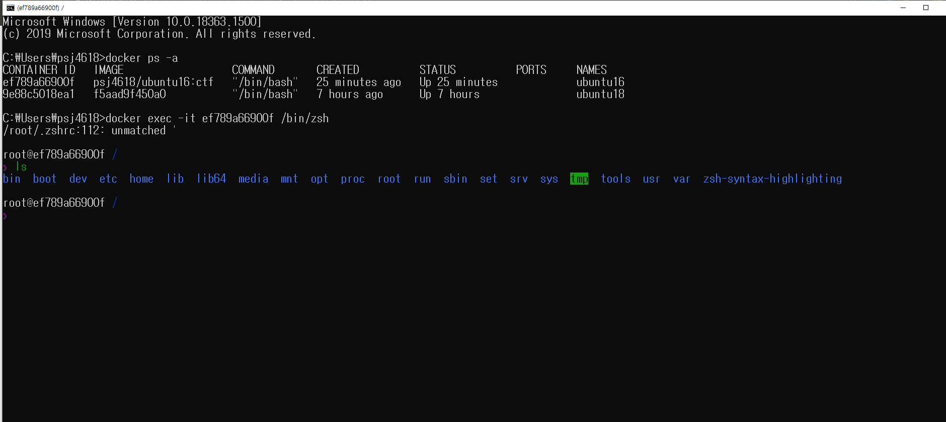 5. docker run -it -d --privileged --cap-add=SYS_PTRACE --security-opt seccomp=unconfined -v CTF:/sharing --name [생성할 container 이름] [images ID] /bin/zsh
